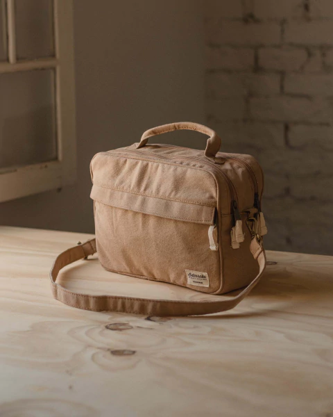 As coleções diferem na matéria prima externa. Cacau, Doce de leite, Sertão, Floresta e Ypê, são feitas em tecido sustentável. Mas também temos Ouro Preto que é uma sarja 99% algodão e 1% elastano, Celeste que é 100% algodão, Moletom mescla e chumbo que são ambos 50% algodão e 50% poliéster. O forro é um algodão sustentável listradinho em preto e branco. A etiqueta e os puxadores são feitos em algodão cru e os metais em bronze.